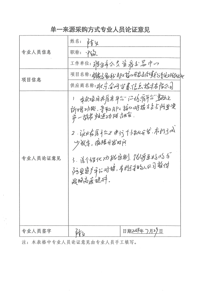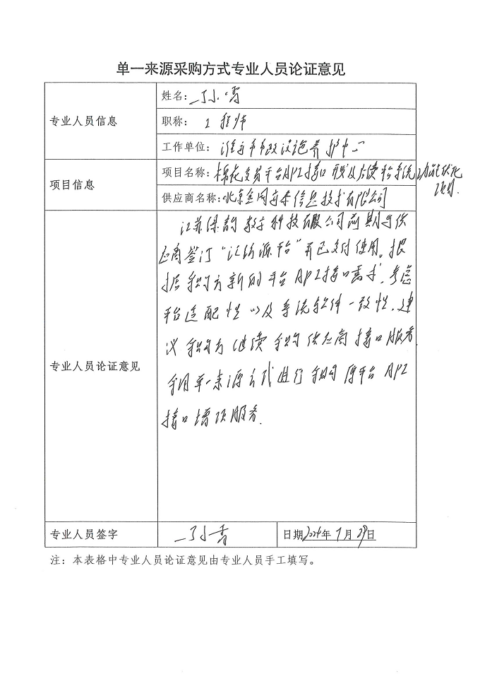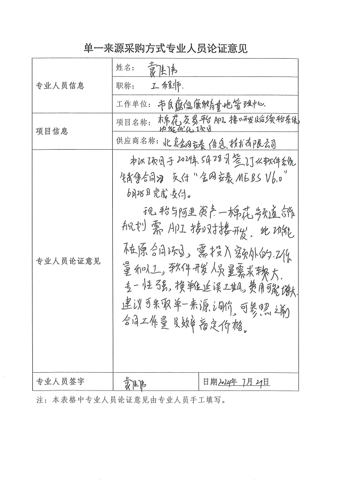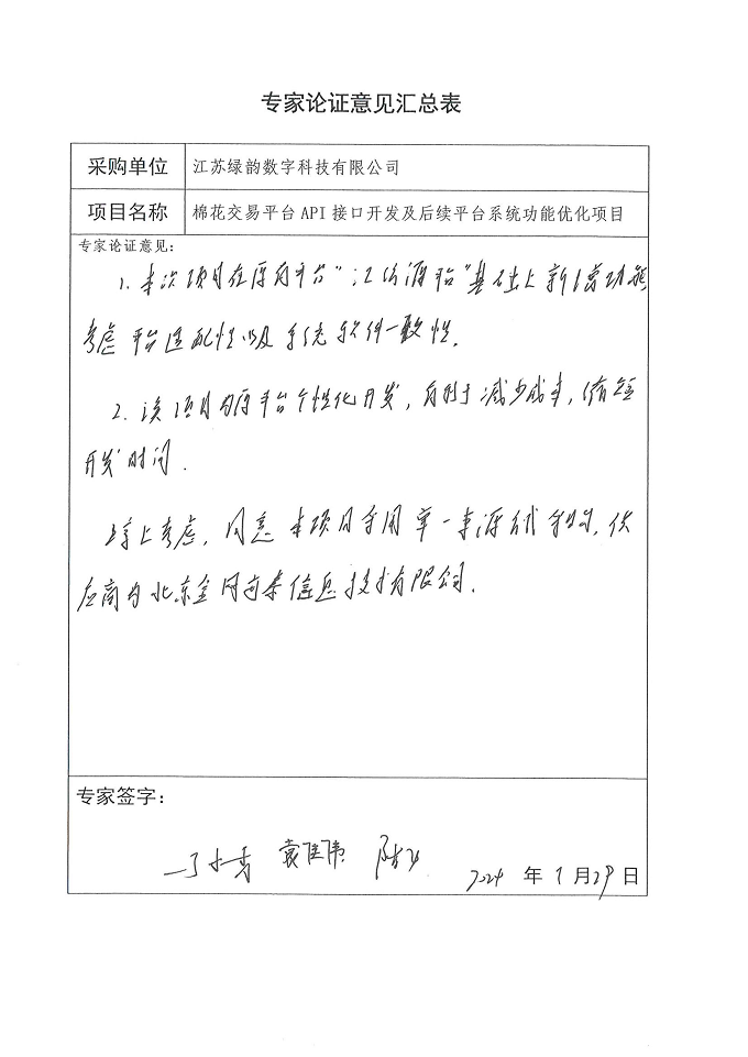 | 一、項目信息 采購人:江蘇綠韻數字科技有限公司 采購項目名稱(chēng): 棉花交易平臺API接口開(kāi)發(fā)及后續平臺系統功能優(yōu)化項目 擬采購的貨物或服務(wù)的說(shuō)明:在現有的棉花交易平臺基礎上開(kāi)發(fā)API接口,實(shí)現平臺與阿里資產(chǎn)棉花頻道的對接,將平臺的交易信息推送至阿里資產(chǎn)平臺生成交易場(chǎng)次。 擬采購的貨物或服務(wù)的預算金額:人民幣伍拾萬(wàn)元整。 采用單一來(lái)源采購方式的原因及說(shuō)明:本次項目擬在原有平臺“匯紡源平臺”基礎上新增功能,采取API接口對接方式與阿里資產(chǎn)-棉花頻道功能融合。在原平臺基礎上進(jìn)行個(gè)性化開(kāi)發(fā),有利于減少成本,縮短開(kāi)發(fā)時(shí)間。該個(gè)性化功能定制,能夠更好的與阿里資產(chǎn)平臺對接,有利于采購人整體戰略高度提升?;谝陨显?,擬對棉花交易平臺API接口開(kāi)發(fā)及后續平臺系統功能優(yōu)化項目采用單一來(lái)源方式采購,以確保項目順利實(shí)施。 擬采購的貨物或服務(wù)的預算金額:人民幣伍拾萬(wàn)元整。 二、擬定供應商信息 名稱(chēng):北京金網(wǎng)安泰信息技術(shù)有限公司 地址:北京市昌平區南邵何營(yíng)路9號院康比特健康產(chǎn)業(yè)園4號樓3層 三、公示期限 2024年8月8日至2024年8月14日(公示期限不得少于5個(gè)工作日) 四、其他補充事宜 無(wú)。 五、聯(lián)系方式 1.采購人信息: 名稱(chēng):江蘇綠韻數字科技有限公司 地址:淮安市經(jīng)濟技術(shù)開(kāi)發(fā)區翔宇中道9號匯金云谷3號樓21層 聯(lián)系方式:陳先生15851746550 2.代理機構信息 名稱(chēng):江蘇中航際項目管理有限公司 地址:淮安市清江浦區億力未來(lái)城4期58號樓二樓118-203 聯(lián)系方式:秦盼 13952345195 附件:專(zhuān)家人員論證意見(jiàn)(見(jiàn)附件)